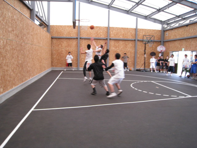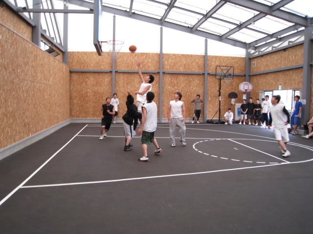 第11回3on3大会もいよいよファイナル。 決勝に進出したのは「三本○チーム」「G○○Fチーム」 高さのG○○Fチームに対してクイックネスの三本○チームの 戦いです。 開始そうそうお互いの身体のぶつかり合う音が会場に響く。 いままで好プレー珍プレー笑いありの楽しい雰囲気が一変。 両チームのガチンコ対決にみんなが注目。 G○○Fチームが高さを生かしてゴールを決めれば、三本○ チームもスピードを生かしてゴール決める。お互いの持ち味を 生かしたすばらしい戦い。 中学生チームも同年代での試合経験はあると思うが、こういう バスケを間じかで見ることはそんなにないと思うのでいい刺激に なったのでは? すばらしいプレーで歓声があがる中、勝利をしたのは「三本○ チーム」。優勝おめでとう。 全試合とうしてナイスパフォーマンスでした。 中学生から46歳まで普段ゼッタイ対戦することないバスケ好き が集まって2時間半くらいですがバスケを楽しむことが出来ました。 ※次回は9月を予定しています。 8月初めには日時を決定して参加チームを募集したいと思います。 またみんなでバスケを楽しもう。(参加料は無料です)